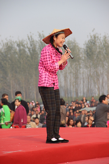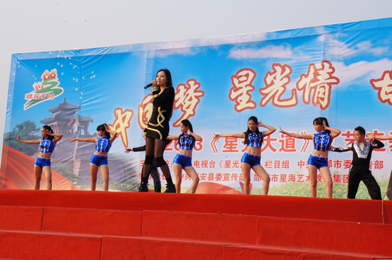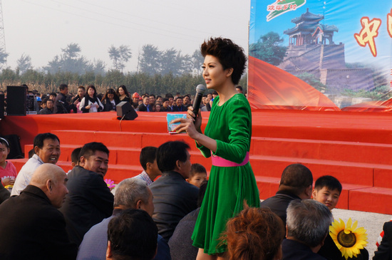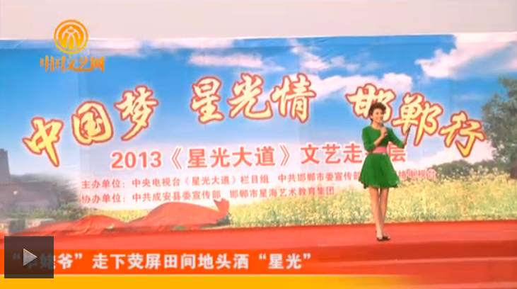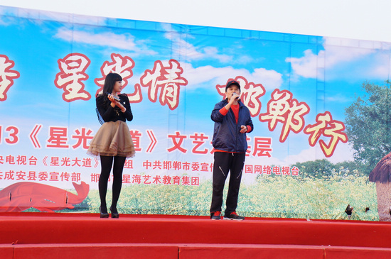 10月17日下午,一場集合了眾多央視《星光大道》草根選手、河北省邯鄲市成安縣的普通農民,由紫檀主持、畢福劍擔任嘉賓的文藝演出,在邯鄲市成安縣道東堡鄉(xiāng)西野莊村的田間地頭熱鬧開場,這場反映了《星光大道》百姓情懷的演出,拉開了“中國夢星光情”《星光大道》文藝走基層活動的帷幕,受到當?shù)匕傩盏臒崃覛g迎。