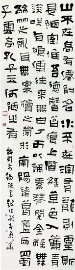 72歲的周俊杰是本次展覽中年紀最大的作者。接到創作任務后兩年,他都在臨秦印,最后創作了以漢代摩崖隸書為基礎的作品李白《秦皇掃六合》。“秦印非常好,也適合用這樣大的尺幅進行創作。文字部分,此詩雄深豪放、氣局宏闊,以此作為書法文本,會將我的創作激情充分調動起來,且隱隱感到將會寫出一件超越我以往水平的作品?!彼f?!懊獞莾热菖c形式的完美結合。名篇方面,我們已經有了經過歷史檢驗的文學藝術,而如何成為優秀作品,還需要當代書法家在表現形式上多加思考?!睍依顒偺镎f。
