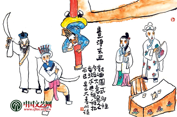 中國戲劇本來就已經是一門很高的藝術,而且戲劇本身也包含著繪畫藝術之美。所謂“畫中要有戲,百看才不膩”,就充分反映了民眾的審美和價值觀。戲劇用繪畫來表現,簡單地照搬或者描摹肯定是不行的,必須根據繪畫的特點進行再創造,就中國畫來說,還必須充分調動筆墨、構圖、造型、色彩諸因素,要不斷探索,不斷實踐,持之以恒,才能有所成就。
