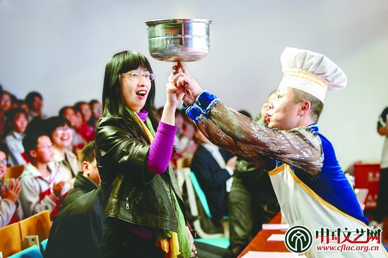 10月24日,由北京市文聯(lián)主辦,北京雜技家協(xié)會(huì)承辦的“讓藝術(shù)為中國(guó)夢(mèng)插上騰飛的翅膀——首都藝術(shù)家走基層系列演出”在北京二中亦莊學(xué)校上演。首都文藝工作者表演了歌曲、魔術(shù)、雜技、啞劇等形式多樣的節(jié)目,受到師生們的歡迎。圖為雜技演員在演出中與觀眾互動(dòng)。