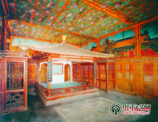 在故宮養(yǎng)心殿西暖閣即三希堂外間向東的墻壁上,畫有一月洞門,兩旁畫木隔柵窗,地面畫青花瓷磚,與室內(nèi)的隔柵和地磚相銜接,使墻壁看上去不再是垂直于地面,而是從室內(nèi)延伸出去,似乎穿過月洞門又有一處可游可賞的花園。借畫中之景豐富室內(nèi)景觀,這在某種程度上與中國園林營造中的“借景”思想不謀而合——畫面極其寫實,畫里的空間幾乎與真實的室內(nèi)空間融為一體,透視感強烈,并且與周圍景物巧妙結(jié)合,形成一種新鮮而神奇的視像效果。如今,在清宮現(xiàn)存保持原貌的這類貼落畫中,具有線法畫特征的有養(yǎng)心殿、倦勤齋、玉粹軒等處,可謂清宮里的“3D繪畫”。