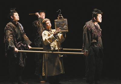 前晚,林兆華、王丁一聯合執導的黑色喜劇《一鳥六命》在東宮影劇院上演。首輪五天的演出為學生公益專場,11月18至20日,該劇還將移師保利劇院演出。《一鳥六命》講述了北宋徽宗年間因一只畫眉鳥而起的連環命案。全劇故事荒誕,現場音樂融合了搖滾樂、曲藝、Beat-box等元素,呈現一種多元拼貼的質感。