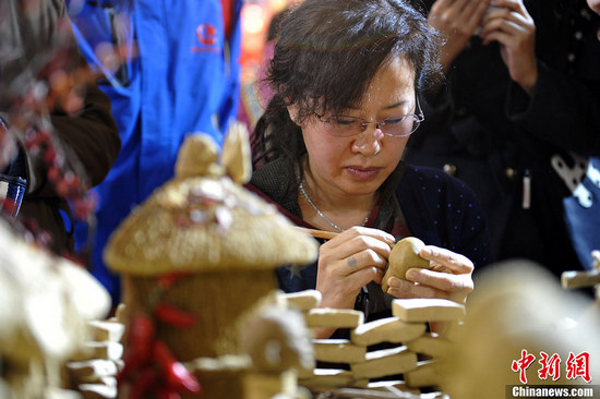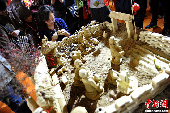 當(dāng)日,在1號館內(nèi),來自黑龍江省的泥塑藝人郝鳳玲在一個泥塑農(nóng)家院旁,現(xiàn)場演示制作一個泥塑農(nóng)家漢子。 這個祖孫三代居住的泥塑農(nóng)家院有住房、糧倉、石磨、板凳等,院落內(nèi)還有一小片自留地,上面還有綠油油的菜苗等。泥塑生動的再現(xiàn)了農(nóng)家小院的微縮全貌,吸引了不少觀眾駐足觀賞。中新網(wǎng)記者 金碩 攝