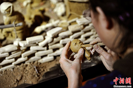 11月7日,第八屆北京文博會在北京國際展覽中心正式開幕。本屆文博會以“促進(jìn)文化貿(mào)易 加快經(jīng)濟(jì)升級”為主題,安排了六大系列100余場活動,設(shè)置16個主題展區(qū),1800多家來自國內(nèi)外的文化創(chuàng)意企業(yè)參展。圖為泥塑藝人正在趕制摔壞的人物。中新網(wǎng)記者 金碩 攝
