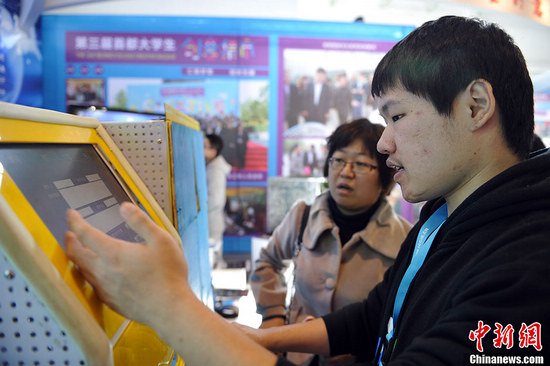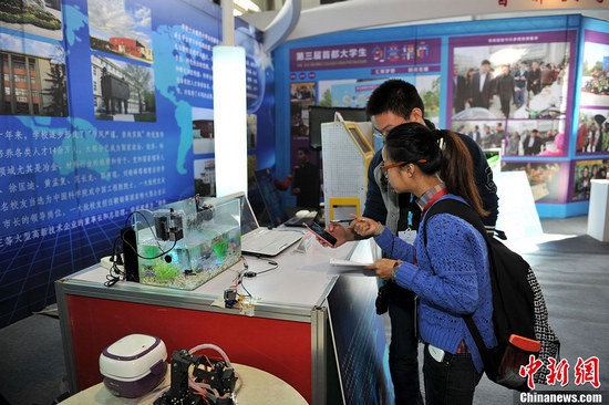 11月7日,第八屆北京文博會在北京國際展覽中心正式開幕。本屆文博會以“促進(jìn)文化貿(mào)易 加快經(jīng)濟(jì)升級”為主題,安排了六大系列100余場活動,設(shè)置16個主題展區(qū),1800多家來自國內(nèi)外的文化創(chuàng)意企業(yè)參展。圖為首都大學(xué)生創(chuàng)意集市上學(xué)生為觀眾講解。中新網(wǎng)記者 金碩 攝