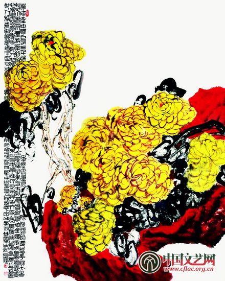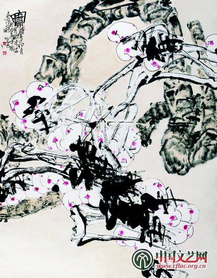 刁呈健先生的畫與我們常見(jiàn)的那些大寫意花鳥(niǎo)畫不太一樣,構(gòu)圖比較新穎,還有一些現(xiàn)代構(gòu)成的技法。而這種現(xiàn)代感,不是照搬西方的那種現(xiàn)代藝術(shù)的構(gòu)圖,而是從中國(guó)的傳統(tǒng)的筆墨當(dāng)中生發(fā)出來(lái)的東西。我覺(jué)得他是當(dāng)代中國(guó)大寫意花鳥(niǎo)畫的一個(gè)杰出代表。