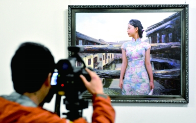 11月18日,一名記者在云南省博物館拍攝朝鮮藝術家美術精品展。當日,“第十三屆亞洲藝術節——朝鮮藝術家美術精品展”在位于昆明的云南省博物館開展。新華社記者 藺以光攝