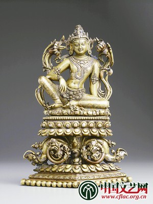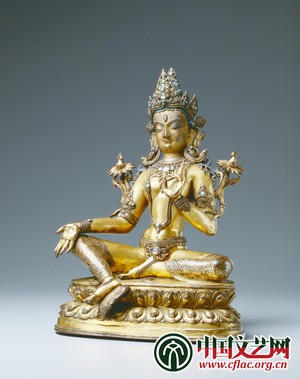 14世紀西藏塑造的綠度母,仍然鮮明地延續著尼泊爾馬拉王朝的藝術烙印。其造像優美,裝飾華麗,讓人見之忘俗。彎眉細眼,雙頰圓潤,面容恬靜祥和。左手結說法印,右手施與愿印,游戲坐姿,左腳下踩一朵蓮花,姿態典雅端莊。整體觀之,氣定神閑,雙肩柔軟,肢體圓潤,顯得妖嬈多姿。
