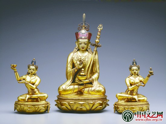 佛像左右兩側各有兩尊女性造像,是藏族王妃益西措杰和印度公主曼達拉娃。蓮花生大師有很多明妃,這兩個最為重要。兩明妃都以半跏趺姿勢坐于圓形蓮座。益西措杰左手供奉寶瓶,曼達拉娃右手供奉嘎巴拉碗。兩個明妃豐腴動人的身體分別向左、右傾斜,與雕塑大師扎那巴扎爾所塑度母像不同。她們纏腰布,著披肩,松軟地垂于大腿,繞過后背和基座,飾以繁復的珠寶:皇冠、耳環、項鏈、臂環、足鏈、腰帶,足部、手部、臉部鎏金,眼睛、嘴唇著色。
