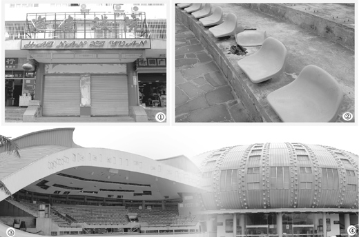 海南戲院大門緊閉(圖①),印象海南島劇場門可羅雀(圖③④),內部座位破損(圖②)。丁汀 張亞攝 制圖:李姿閱