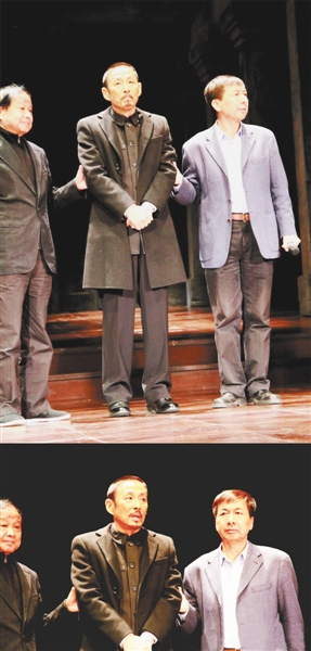 前晚,陳道明在北京人藝院長張和平(左)和書記馬欣(右)攙扶下登臺向觀眾致歉。