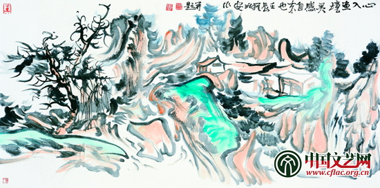 羅治安把自己的山水畫統(tǒng)攝于“禪境本真”總題旨之下,足見(jiàn)其用心所在、志向所在、理想所在與追求所在,蘇東坡說(shuō):“筆勢(shì)崢嶸,辭采絢爛,漸老漸熟,乃造平淡。實(shí)非平淡,絢爛之極。”此語(yǔ)用來(lái)概括羅治安的藝術(shù)追求和藝術(shù)創(chuàng)作,是十分恰切的。澄懷觀道,是他的生命追求,是他為藝的操守,還是他在藝術(shù)創(chuàng)作上的執(zhí)著與堅(jiān)持。