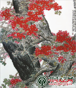 潑墨與重彩的結合,或者更寬泛地說,筆墨與色彩的配合,是寫意花鳥畫以至所有寫意中國畫革新的難題,也是近現代寫意花鳥畫變革的重點。一般說來,在寫意花鳥畫中筆墨與色彩難以兼容,既注重筆墨又注重色彩,容易給人浮躁艷俗的感覺,但如果筆墨與色彩配合得巧妙,便可以產生出奇制勝的效果,如齊白石的“紅花墨葉”、張大千的潑墨潑彩,非但不俗,而且很雅,其關鍵在于把握筆墨與色彩配合的分寸和火候。工筆與寫意的結合為潑墨與重彩的結合打開了一條通道。朱全增在前人開辟的道路上繼續前行,對筆墨與色彩配合的分寸和火候把握得適度而巧妙。例如他的《地涌金蓮》《霜葉紅勝五月花》《劍麻》《香染九垓》等花鳥畫佳作,筆墨與色彩或清麗、或濃艷、或淡雅、或繁豐,都和諧統一、格調脫俗。