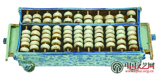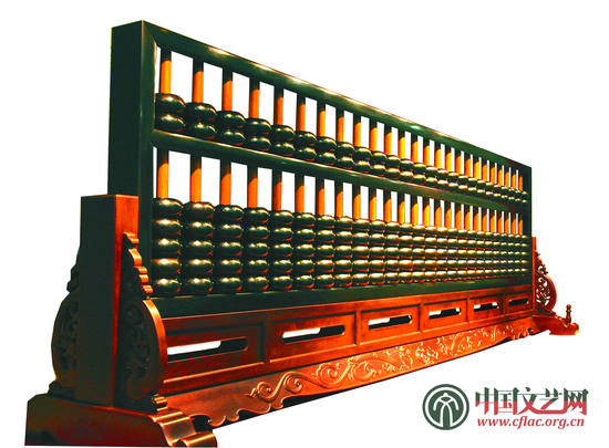 珠算獨特的文化內涵,也為藝術家們提供了豐富的創作資源。元代詩人劉因曾以《算盤》為題作詩一首:“不作甕商舞,休停餅氏歌,執籌仍蔽簏,辛苦欲如何?”作者借算盤告誡人們,發財致富必須依靠自己的辛勤勞動。明代作家施耐庵在其《水滸傳》一百零八將中,塑造了一位手托大算盤的神算子蔣敬。清代文學巨匠曹雪芹在《紅樓夢》第二十二回“聽曲文寶玉悟禪機,制燈謎賈政悲讖語”中,記載了一則“算盤燈謎”:“賈政又看迎春的,道:‘天運人功理不窮,有功無運也難逢。因何鎮日紛紛亂?因為陰陽數不通?!蛞晃??!Z政道:‘是算盤?’迎春笑道:‘是’?!庇荷耘橙酰髡咭运惚P“別人撥一撥才動一動”的特點,暗示她“被動”的一生。現代作家茅盾在其《林家鋪子》中,更是多次運用算盤來表現人物性格。其中有這樣一段描寫:“在價目上,林先生也格外讓步;遇到那位顧客一定要除去一毛錢左右尾數的時候,他就從店員手里拿過那算盤來算一會兒,然后不得已似地把那尾數從算盤上撥去,一面笑嘻嘻地說:‘真不夠本呢!可是老主顧,只好遵命了。請你多作幾筆生意吧!’”這里通過對林老板“拿、算、撥、說”這一連串動作描寫,其“精靈機巧”的生意人形象躍然紙上。
