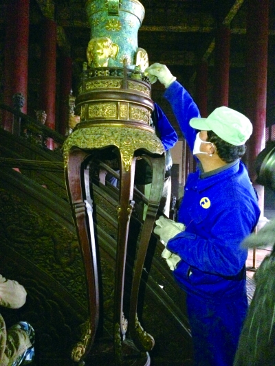 工作人員在故宮太和殿內(nèi)對(duì)文物進(jìn)行除塵作業(yè)。翟 群 攝
