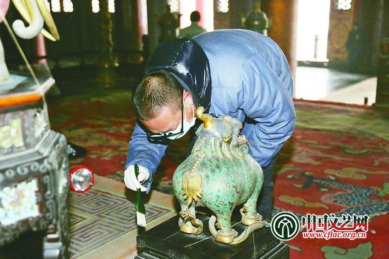 專業(yè)人員對太和殿文物進(jìn)行除塵保養(yǎng)