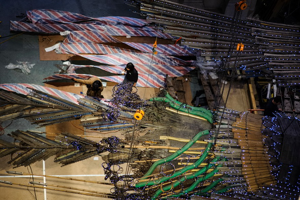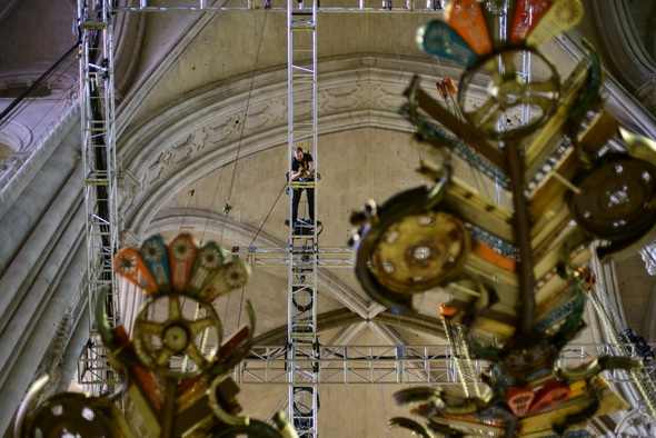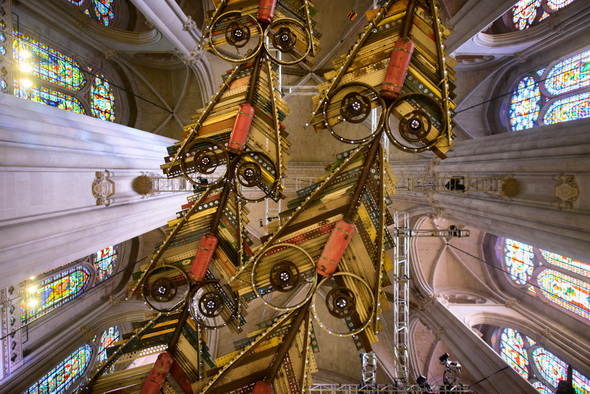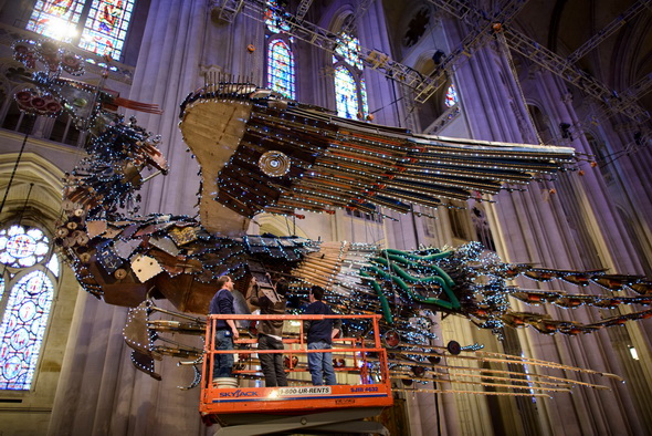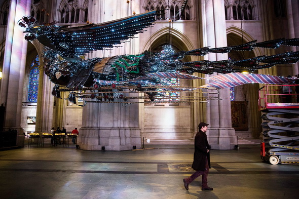 不久前的一個冬日下午,一個八人小組為兩尊鳥兒紀念雕塑完成了最后的修飾工作,它們被懸掛在晨邊高地圣約翰主教座堂(Cathedral Church of St. John the Divine)宏偉的正廳之中。這兩只鳳凰在距離地面20英尺(約合6米)的上空盤旋,閃爍的小燈泡照亮雕塑各種奇異的質材:用層次完美的鏟子制成的羽毛;用防風帽制成的羽冠;鳥兒的頭部是用電鉆做的;身體是用其他廢棄的建筑殘骸制成,包括鉗子、鋸、螺絲刀、塑料軟管和鉆頭。