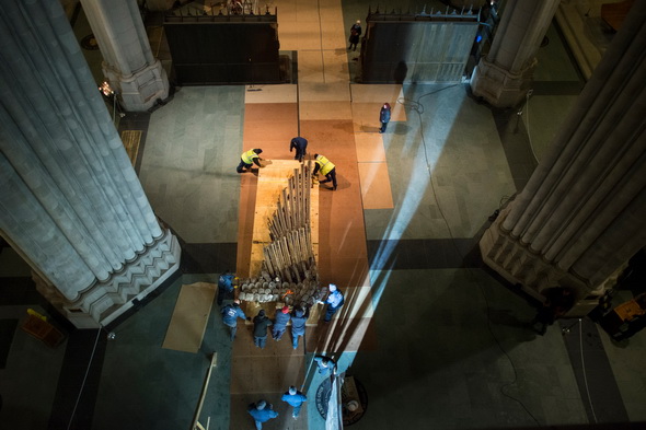 上月月底,九輛平板卡車載著這對鳳凰來到紐約。它們重達12噸,分別長達90英尺和100英尺(約合27.4米和30.4米),動用了30多臺起重機和140英尺(約合42.6米)的捆扎帶,把它們升到高處,使它們顯得仿佛在教堂內飛翔。展出時間約一年。
