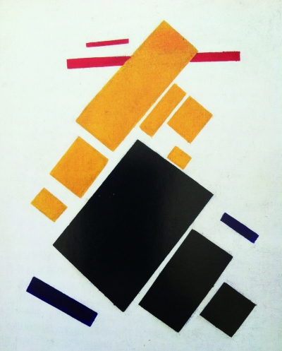 馬列維奇最初醞釀出“至上”的概念時,決意在作品中取消所有對物質世界具體事物的指示和描摹。他為觀眾呈示的是一種全新的圖像語言,并認為這種語言包含了“建構世界的完整體系”。馬列維奇的至上派作品在圣彼得堡的“0.10:最后的未來派”展覽(1915)上首次展出。他的參展畫作共39幅,《至上派構圖:飛機飛行》便是其中之一。正方形、長方形和線條共13個構成圖形,分別為紅、黃、黑和藍色,被精心地配置在一片白色背景上。這些圖形看上去或上升或下降,也會暫時地靜止穩定一下,但穩定只是為了再次上升和下降。畫面傳遞了一種流動變化狀態。馬列維奇解釋道:“我的新畫作并不僅僅屬于地球。地球已經被捐棄,就像人們棄置一棟房屋。地球已經被摧毀?!闭沁@種對最基本的物理力量——地球重力——的挑戰,讓馬列維奇的抽象圖案出現在了一個精神和心靈的平面上。