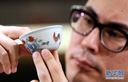 3月12日,蘇富比亞洲區副主席仇國仕向記者展示即將亮相蘇富比拍賣的、估價為2-3億港元的玫茵堂珍藏明成化斗彩雞缸杯。香港蘇富比將于4月8日舉行重要中國瓷器及工藝品春季拍賣會,估價為2-3億港元的玫茵堂珍藏明成化斗彩雞缸杯成為本次拍賣的焦點。(李健亞)