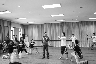 在《岳云》排練現場,記者看到了演員們在鏡前一絲不茍地嚴摳動作細節,苦練基本功;聽到了一遍又一遍的音樂唱段的練習聲;主創們不時圍坐在一起,對舞美設計激烈討論。在嘗試高難度特技時,趙宇更是親自上陣,與演員們一起“飛檐走壁”,以期達到更好的演出效果。