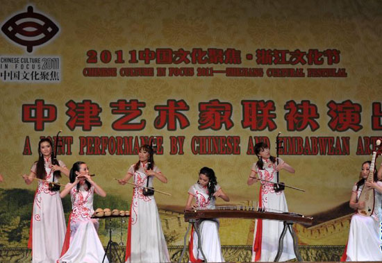 11月15日,在津巴布韋首都哈拉雷,演員在表演節目。當日,“2011中國文化聚焦·浙江文化節”在津巴布韋首都哈拉雷舉行首場演出。由文化部等9部門聯合主辦的“中國文化聚焦”活動,是中國政府為兌現中非合作論壇北京峰會和第四屆部長級會議承諾,于2008年推出的對非年度交流活動,迄今已成功舉辦四屆,成為新時期中非文化交流領域最具影響力的品牌項目。作為該活動今年的重點項目,“2011中國文化聚焦·浙江文化節”由文化部、中國駐埃塞俄比亞大使館、中國駐津巴布韋大使館、浙江省文化廳聯合主辦。新華社記者趙穎全攝