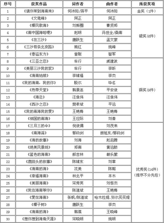 由中國音樂家協會、中共海南省委宣傳部共同主辦,海南省文學藝術界聯合會承辦的“唱響海南”全國歌曲創作征集評選活動,自2012年9月啟動以來,得到了全國廣大詞曲作者的積極響應,共收到應征作品1180件。經評委會嚴格組織初評、復評和終評,最終評選出金獎作品1件,銀獎作品6件,銅獎作品9件,優秀獎作品14件,并將擇時舉辦頒獎活動?,F將評選結果公告如下: