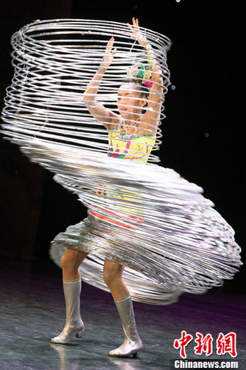 4月14日晚,臺北孫中山紀念館大劇場,來自大陸的呼啦圈“小天霸”、吉尼斯世界紀錄保持者金琳琳表演呼啦圈絕技,技驚全場。中新社發 董會峰 攝