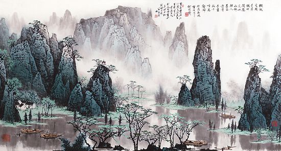 白雪石筆下的漓江山水,無論是經典的巨制,還是精美的盈尺小品,都有一股清秀明快、淡雅潤澤、飄逸靈透、清新亮麗之氣,他的筆法古樸、穩健,或點染、或皴潑,氣聚神凝,筆隨心動,技藝法度自然天成,在精神層次上達到了神遇而跡化、天人合一的境界,這也成為唯真唯美“白家山水”筆墨樣式和語言的典范。