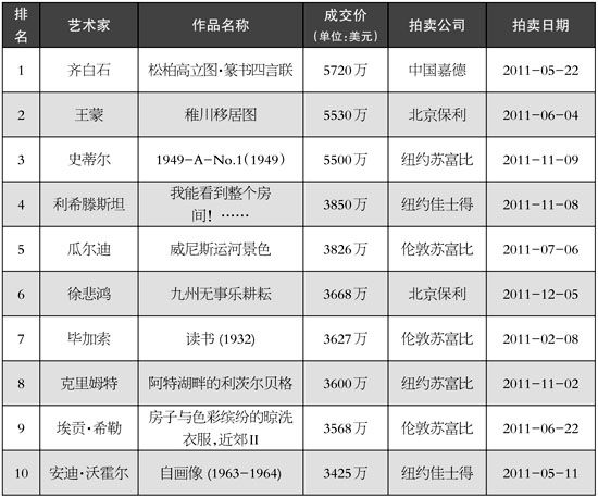 從以上表格不難看出,2011年全球藝術(shù)品成交前十名,中國的齊白石、王蒙、徐悲鴻作品占據(jù)三席,充分顯示了中國在全球藝術(shù)品交易中的重要性。據(jù)了解,2011年,中國藝術(shù)品拍賣百萬美元以上的作品有684件,這一數(shù)量已經(jīng)超過美國。而在2011年全球藝術(shù)品成交最高價前100名中,其中的30件誕生于香港、北京和杭州。