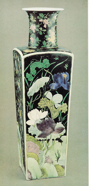 圖一 清康熙-黑地素三彩花卉紋方瓶