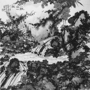 本作品描繪的是雁蕩山靈巖寺后的一個小瀑布的景色。雖然只取了小龍湫景觀的一角,但卻從平凡的題材中升華出了不平凡的藝術(shù)境界。畫面中的龍湫水是視覺中心,配以山巖與花草結(jié)合,既不同于前人的鳥瞰式山水,又不同于僅配以假山的單純花卉。而在表現(xiàn)上,為使山水與花卉和諧地統(tǒng)一在一個實景之中,作者以變化豐富的筆線構(gòu)成畫面的骨架,不僅具有構(gòu)圖的骨力與氣勢之美,也頗有西畫中的構(gòu)成意味。