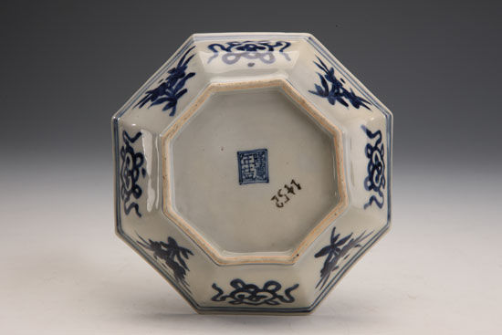隆慶一朝時間較短,景德鎮窯瓷器遺留傳世的器物并不多,以小件器為主,少見大器,胎、釉較細膩。青料用回青,呈色穩定、純正,藍中泛紫,但不像嘉靖器般紫得厲害。紋飾與嘉靖朝相近,佛道內容較多。多六角、八角等造型。帶年款的器物甚少,官窯器的款識有“大明隆慶年造”和“隆慶年造”兩種,不見“制”字款;民窯器款有“隆慶年造”或“制”四字款;吉語和贊頌語款有“萬福攸同”、“福壽康寧”、“富貴佳器”等。因此,這件帶年款的八角盤雖為民窯器,但也彌足珍貴。