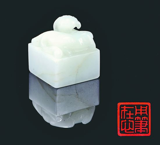 印章選材上等白玉裁切而成,玉質極佳,如割脂截蠟。頂琢一半伏臥之螭龍,寓動于靜,神情活靈活現,煞是可愛。印面以陽雕法作四字篆書“用筆在心”印文,行刀老練,印文法度嚴謹,氣韻古樸。所刻印文為唐代書法大家柳公權答穆宗所問,論用筆之法,全文為“用筆在心,心正則筆正”,此語可謂別有深意,不單論書法之道,亦是為人處世之真理。