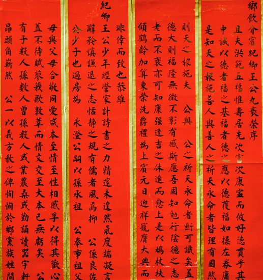 《鄉(xiāng)飲介賓紀(jì)卿王公九秩榮序》壽屏共12幅,單幅寬39厘米,長180厘米,紅宣紙本。正文楷書,文后為“舉賀”翟奎文等10人、“闔學(xué)”王建封等10人、“親友”張克讓等90人、“鄉(xiāng)眷”翟六合等40人、“族人”王五桂等40人姓名,尾署“龍飛光緒十三年二月初四日谷旦”。由“闔學(xué)”署名“王建封、于浚川、初星海”等均為昌邑人推測,該序主人王紀(jì)卿應(yīng)為昌邑人。由序文中“余與公誼系鄰村”可知,該序的撰文者張匯堂也是昌邑人。該序的書寫者為郭育才,字木初,號升生,濰縣人,出身書香世家,光緒甲午恩科二甲第四十名進(jìn)士,朝考二等,入選翰林院庶吉士,散館改兵部主事,受派辦理安徽六安州霍山縣教案,事后,安徽巡撫奏薦任池太同知,調(diào)任郵傳部郎中,襄辦全國船政,生性恬靜嚴(yán)謹(jǐn),為官清正廉潔,為人稱道,工書法,精魏碑,晚年益蒼秀婀娜,曾寓居上海,擅名一時,卒年七十五。該幅作品是存世不多的郭育才早年工楷書作,通篇以趙體為主,一絲不茍,由此可以窺見其楷書功底和早年書風(fēng)。