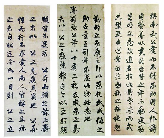 《恭祝皇清太學(xué)生濬公張年兄八秩榮壽序》壽屏原裝裱于12面屏風(fēng)上,另一面為12幅山水畫。壽屏單幅寬57厘米,長157厘米,白宣紙本,正文行草書,文后為“親友”姜鏷等50人、“族人”張九思等27人姓名。由壽序內(nèi)容可知,該序主人張濬為昌邑人。壽屏的撰書人翟德先亦為昌邑人,光緒三十三年本《昌邑縣續(xù)志》卷五《人物·文學(xué)》有傳。傳曰:“翟德先,字祗臺,石埠人。中嘉慶辛酉順天第三名舉人,連捷進(jìn)士。學(xué)問淵博,文宗名家。著有《蝶階百詠》。初宰高陽,自以絀于吏治,改泰安教授,與諸生講論不倦,成就者多。卒于任。平生著述多留任所,無由采取,僅存《百詠詩序》。”光緒年間纂修《昌邑縣續(xù)志》時,翟德先的文章即無由采集,當(dāng)時看到的《百詠詩序》也已散失,故這篇《恭祝皇清太學(xué)生濬公張年兄八秩榮壽序》可以說是現(xiàn)知翟氏唯一的存世文章。另外,其書法通篇雄壯恣肆,筆墨俱妙,亦是不可多得的藝術(shù)精品。