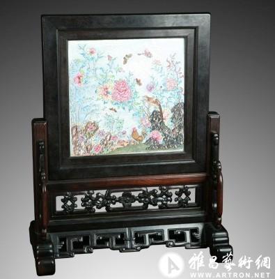 清乾隆紫檀宮廷嵌瓷胎畫琺瑯花鳥紋插屏