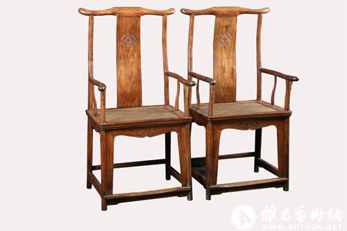 海外回流藝術品一般是當朝輸出或戰爭散落,其工藝、材質皆為上上之選。本場拍賣一件“明黃花梨雕卷草紋四出頭官帽椅(一對)”非常珍罕,此物原為美國西雅圖藏家所有。四出頭官帽椅是一種搭腦和扶手都探出頭的椅子,其造型像古代官員的帽子而得名,是家具檔次的象征。此對四出頭官帽椅由黃花梨制成,椅的搭腦和扶手均出頭,搭腦過立柱后仍向前探,并在盡端向外挑出、翹起,搭腦中段弧度呈羅鍋式,扶手兩端外撇,與搭腦和諧統一,曲線優美,富有彈性,造型十分夸張。靠背板絢麗呈“S”形,中央雕卷草圍繞蓮花支托狀圖案,圓形立柱與后腿一木連做,兩扶手正中下接聯幫棍,以下粗上細直立,即“老鼠尾巴”的做法,鵝脖部分向前傾斜,與適合人體靠背的曲線相對唱和古人講究坐相,通過椅子靠背板與扶手曲線的造型語言來傳達坐者的威儀與端莊。上下無一絲裝飾,結構簡練之極,完全采用線條和弧度來處理,線條曲直相同,方中帶圓,充分體現了明式家具簡潔明快的特點,是明式椅具中的精品。