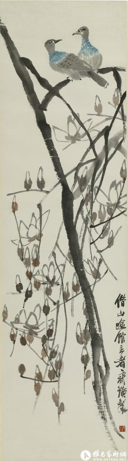 齊白石 玉蘭斑鳩 設色紙本 立軸 178×47cm