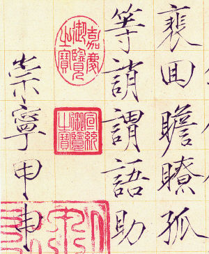 此前廣東媒體報道,在深圳拍出的瘦金體《千字文》書法的落款也為“崇寧甲申歲宣和殿書賜童貫”。此冊“千字文”在清朝再次由皇宮收藏,落入了另一位喜好書畫的皇帝——乾隆手中。乾隆在“千字文”上留下了“八徵耄念之寶”珍賞印。