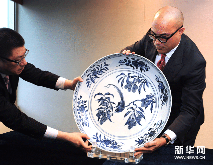 (1)3月5日,蘇富比拍賣行工作人員在展示明朝永樂年制造的青花“荔枝綬鳥”圖大盤,估價(jià)5000萬至8000萬港元。