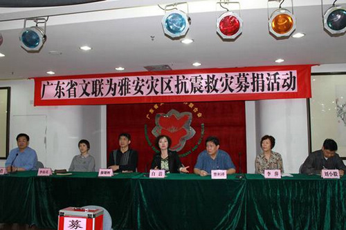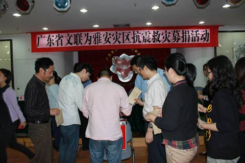 當前,省文聯正在積極籌備27日組織廣東文藝界進行賑災義演募捐活動,廣東戲劇界28日將組織戲劇名家進行義演募捐。省攝影家協會在雅安地震當天就在協會活動中向災區捐款六千多元;連日來,許多藝術家、音樂人也在積極組織開展創作活動,如連向先、高翔等詞曲作者連夜創作了《我們和你在一起》、《我們一起扛》、《愛心飛翔》等歌曲,為災區人民鼓勁。
