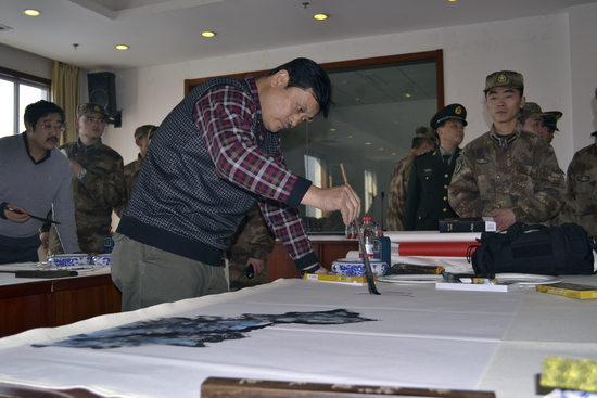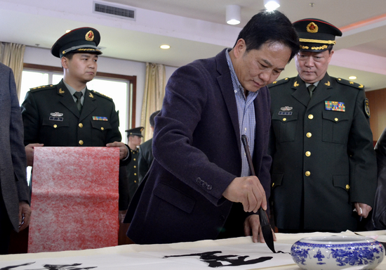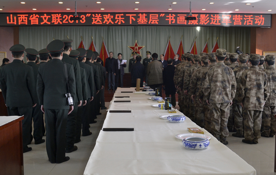 新春的腳步聲清晰可聞,濃濃的年味兒撲面而來。2月6日(農歷臘月二十六),由山西省政協常委、省文聯黨組書記、省書協副主席張根虎帶隊,山西省文聯、山西大眾書畫院與山西省書法家協會、山西省美術家協會、山西省攝影家協會組成的“送歡樂下基層書畫攝影進軍營”慰問團一行30人,帶著黨和政府的溫暖來到太原市國防教育訓練中心進行慰問和文化服務,為這里的官兵們送上一份豐富的節日文化大餐,受到廣大官兵的熱烈歡迎。