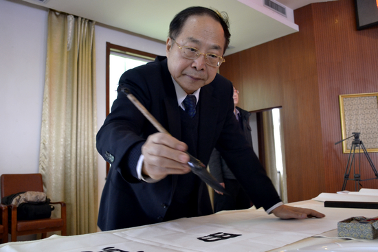 “五牛圖”是山西大眾書畫院副院長張懷文精心所創,他筆下的健碩之牛,或筋骨畢露疲憊力田,或聳肩抵尾橫去斜奔,或不驕不躁沉默坦然,皆筆墨蒼健酣暢,渾樸遒勁,終生勞瘁,事人而安不居功。這時,幾個戰士們抬著國防教育訓練中心大門巨幅春聯“能打仗打勝仗鑄龍城精兵、建窗口創一流衛省城平安”,“世紀神州添錦繡,蛇年偉業更輝煌”,大家都被由省文聯黨組副書記、省書協主席石躍峰創作的氣勢磅礴的書法作品所震撼,這些催人奮進的作品與軍隊昂揚的斗志、頑強的作風相得益彰。