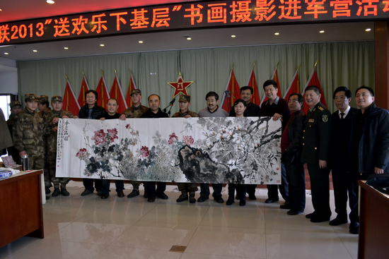 由省美協王學輝、孫海青、郝向炫、劉彩軍、任曉軍、喬亞丁、徐晉平、董志敏、李桂平、高雪濤共同創作了一幅精品——“春色滿園”百花迎春圖把現場氣氛推向了高潮。牡丹花的雍容與富貴、嬌艷和大氣,玉蘭花在一片綠意盎然中開出大輪的白色花朵,令人感受到一股難以言喻的氣質,委實清新可人,這幅花鳥韻味的國畫春情洋溢,給官兵們帶來了春天般的希望。