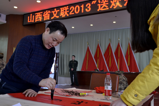 山西省政協常委、省文聯黨組書記、省書協副主席張根虎表示,“送歡樂、下基層”是山西文聯常年開展的一項重要文化品牌活動,是一項深受群眾歡迎的公益性惠民文化活動,是一項得民心、順民意、惠民生的重要活動,也是推進文化大發展大繁榮的實際舉措。此次慰問活動也是“走基層、轉作風、改文風”的具體行動,是落實黨的文化惠民政策的生動實踐。相信我們的藝術家通過這次慰問活動,一定能夠更加密切與廣大官兵的血肉聯系,加深與廣大官兵的魚水深情,為廣大官兵送上精彩紛呈的文化盛宴,豐富和活躍廣大官兵節日文化生活,努力為人民放歌、為人民抒情、為人民祝福,努力營造歡樂祥和、喜慶文明的節日氛圍。