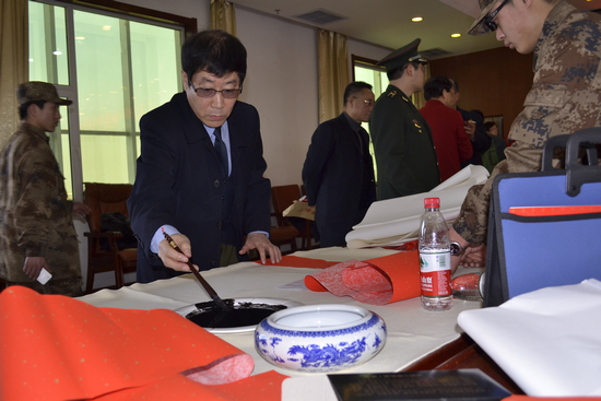 簡短的儀式結束后,由省文聯主席、省書協名譽主席李才旺同志為活動開筆,那飽含真情、蒼勁剛健的“魚水情深”,拉近了官兵們和藝術家們的距離,表達了藝術家們對廣大官兵的崇敬之情。書畫家們隨即投入了緊張的創作中,此時,幾乎每位藝術家的案桌前都被官兵們“團團圍住”,有些甚至排起了長隊。官兵們自選對聯內容,然后由藝術家題寫。“福星高照全家福、春光耀輝滿堂春”、“小康家庭歡樂日、春回大地艷陽天”……一副副對聯寄托著廣大官兵美好的愿望,也凝聚著藝術家們對戰士們的濃濃情意。