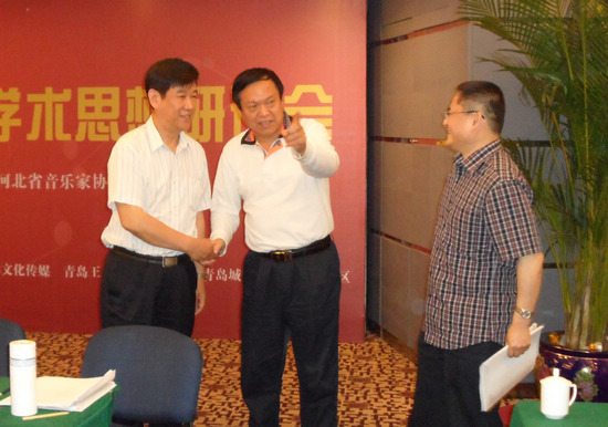 山東省文聯黨組成員、副主席、音協主席張桂林(左),中共城陽區委常委尹世逸(中),山東省音樂家協會副主席劉新海在研討會上的留影 孟祥寧 攝