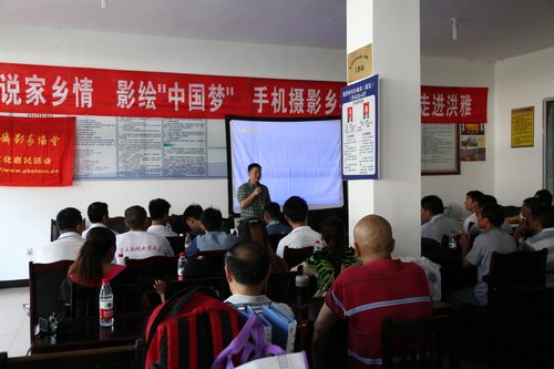 授牌儀式結(jié)束后,志愿者們?cè)跐h王鄉(xiāng)建設(shè)村為30多名當(dāng)?shù)厥着l(xiāng)村手機(jī)攝影會(huì)員講授了手機(jī)攝影輔導(dǎo)課程,這也是輔導(dǎo)站成立后的第一課。主講人、攝影志愿者吳歆結(jié)合當(dāng)?shù)貙?shí)際,用簡(jiǎn)單形象的語(yǔ)言,闡述了手機(jī)攝影的廣泛運(yùn)用,傳授了手機(jī)攝影的拍攝技巧,受到會(huì)員們的好評(píng)。