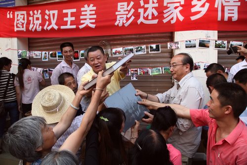 在為期一天的活動(dòng)中,攝影志愿者還舉辦了手機(jī)攝影作品展,展出了志愿者們利用前一天采風(fēng)創(chuàng)作的反應(yīng)當(dāng)?shù)仫L(fēng)土民情的手機(jī)攝影作品,同時(shí),選取部分漢王鄉(xiāng)當(dāng)?shù)厝罕娛謾C(jī)攝影作品一并打印參展。當(dāng)日逢場(chǎng),數(shù)百名漢王群眾觀看了展覽,賈躍紅、王國(guó)榮、王成為觀展群眾贈(zèng)送了攝影畫冊(cè)。